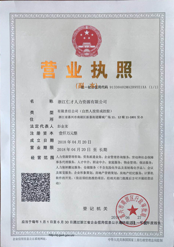 2018年4月20日浙江仁才人力資源有限公司正式成立。
